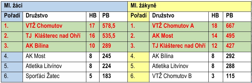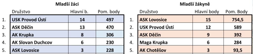 Závěrečné třetí kolo krajského přeboru družstev mladšího žactva rozhodlo o postupujících do finále. V Lovosicích vyhrála domácí děvčata ASK Lovosice a chlapci USK Ústí nad Labem. V Klášterci nad Ohří byli nejlepší chlapci domácího klubu TJ Klášterec a děvčata VTŽ Chomutov. Do finále postupují tři nejlepší družstva v každé skupině. Souboj o medaile se uskuteční v sobotu 27.9. v Bílině.