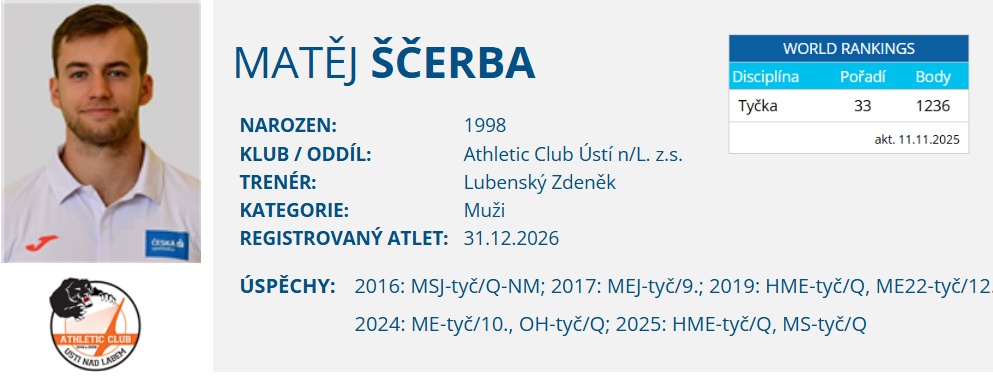 Tyčkař Matěj Ščerba (AC Ústí) skončil v anketě Českého atletického svazu ATLET ROKU 2025 na 21. místě. Letošní sezóna mu vyšla parádně. Dokázal zvítězit na mistrovství ČR v hale i na dráze. Na halovém mistrovství Evropy v Apeldoornu skončil čtrnáctý. Na mistrovství Evropy družstev v Madridu si vylepšil osobní rekord na 5,70 metru a bral dělené třetí místo. Na mistrovství světa v Tokiu skončil osmnáctý.